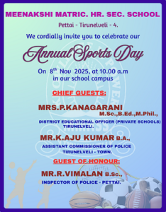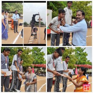 Our school celebrated its Annual Sports Day with great joy and enthusiasm on 08.11.2025. The event began with the march past, lighting of the Olympic torch and the chief guest’s speech encouraging students to stay active and healthy. Students participated in various events like Running race, relay, hurdles, hoops rolling and cone relay. The colourful aerobic dance and yoga performance added charm to the celebration.